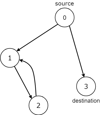 All paths from the source node end at the destination node, but there are an infinite number of paths, such as 0-1-2, 0-1-1-2, 0-1-1-1-2, 0-1-1-1-1-2, and so on.Input: