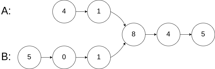 The intersected node's value is 8 (note that this must not be 0 if the two lists intersect). From the head of A, it reads as [4,1,8,4,5]. From the head of B, it reads as [5,0,1,8,4,5]. There are 2 nodes before the intersected node in A; There are 3 nodes before the intersected node in B.Example 2: